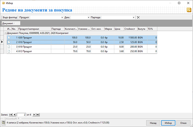 3. Избор — след натискане на бутона Напред, в същата форма системата показва всички редове от избрания документ за покупка. От тук може да изберем кои продукти да бъдат генерирани в документа за продажба. След като маркираме желаните редове, натискаме бутон Избор.