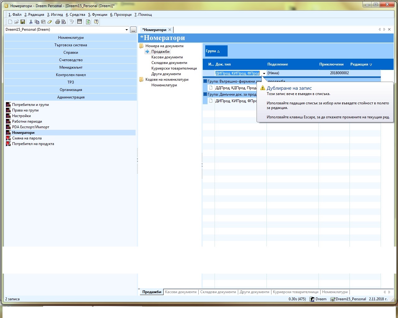 Номераторите можете просто да редактирате стойността в колона Приключени за ФПрод и кредитни/дебитни -- не разбирам защо се опитвате да добавите нов ред. В този списък можете да имате повече от един ред за ФПрод само ако фирмата потребител на продукта има настроени няколко поделения (Варна, Пловдив и пр.) които работят с различни "кочани" фактури.
